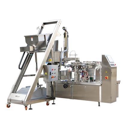 2.旋轉全自動給袋式真空包裝機由兩種分離的旋轉式機體組成(分別為充填系統和真空系統).充填系統為間歇式旋轉運轉,真空系統為連續式旋轉運動。