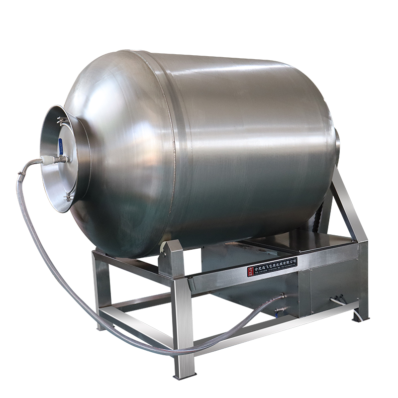 真空滾揉機是將塊狀肉在真空狀態下,將肉的纖維打開。通過筒體的轉動進行滾揉、摔打,使腌制原料充分的進入肉的纖維中。從達到快速腌制跟嫩化的作用。從而獲得高口感品質的肉。也使肉的出成率獲得一定量的增加。